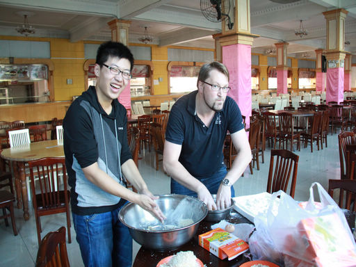 在开幕式上,闫海蓬老师做了简短的德国文化节活动介绍,随后德国友人Toni对即将准备制作的德国美食Schnitzel进行了介绍,在大家的掌声和欢呼声中,同学们开始学习制作Schnitzel。Toni用我们准备好的食材,手把手地教各位同学制作德国美食Schnitzel。同学们认真地学习其制作方法,并随后品尝亲手制作的美食。为了让更多的同学品尝到美味的Schnitzel,同学们和Toni一起把做好的美食,拿到学苑食堂前,共路过的同学免费品尝。