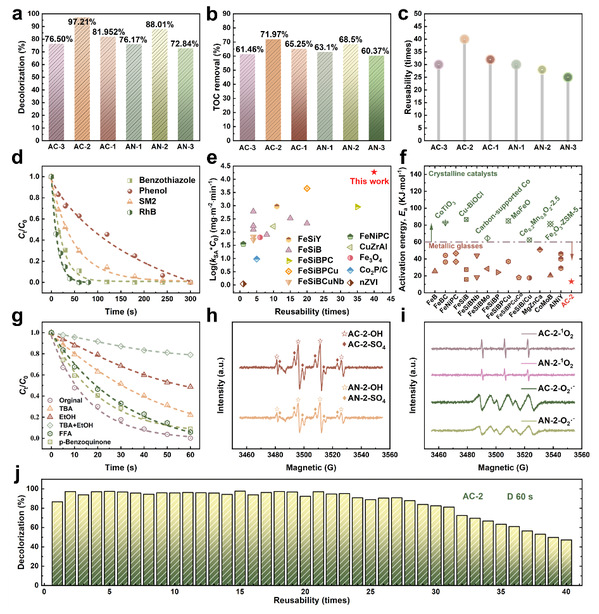 图2 a)各催化剂对25 mg L−1 RhB 的脱色效率。b)铸态纤维和退火纤维之间TOC去除率的比较;c)催化剂样品的可重用性比较;d)AC-2纤维对各种有机污染物的降解效率;e)AC-2与其他催化剂的降解能力比较;f)AC-2与其他非晶和结晶催化剂之间的活化能(Ea)比较;g)淬火实验;h,i)AC-2和AN-2的ESR实验;j)AC-2的可重用性。